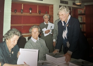 Pieksämäen Lotat -kirjaYlihoitaja Eila Hulkkonen kokosi ja kirjoitti Pieksämäen Lotat -kirjan (2006). Hän lahjoitti käsikirjoituksen Lottaperinneyhdistykselle julkaisemista varten. Koska yhdistyksellä ei ollut varoja kirjan painattamiseen, Eila maksoi painokulut, jotka yhdistys sai maksettua takaisin parissa kuukaudessa kirjan suuren menekin ansiosta. Kuvassa vasemmalla Eila Hulkkonen jakamassa omistuskirjoituksia vieressään yhdistyksen ensimmäinen puheenjohtaja Eila Harju. Taustalla ensimmäinen sihteeri pikkulotta Pirkko Joki ja oikealla nykyinen puheenjohtaja Anna-Liisa Väisänen. Pieksämäen Lotat -kirjassa esitellään Pieksämäen Lotta Svärd -yhdistyksen historiaa sekä Pieksämäen lottien nimet sen mukaan, mitä tietoja on ollut saatavissa.